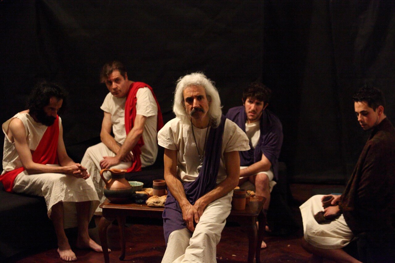 Arriba Naty Menstrual invoca a José Sbarra, abajo el elenco del Banquete de Platón, ambos en el primer piso de Bolívar 646.Otro elemento que contribuyó a que corriera la bola de nuestra existencia, y que nos ayudó a llenar estantes, fue el remanente de libros de poesía de José Luis Mangieri, el legendario editor que había fallecido poco tiempo antes, dejando miles de libros en un depósito. Con esos libros, junto al catálogo de Cinco Pantalones, una compra que le hicimos a Losada y un aporte de nuestras bibliotecas, abrimos la Libre. Muchas son las manos que quieren escribir versos inmortales, pocas las que están dispuestas a mover cientos de cajas de quince o veinte kilos para que esos versos circulen. Las manos de Simón estaban entre esas pocas. Él se encargó de catalogar y desplegar todos esos títulos en el primer piso del local. Además rastreó a todos los autores, lo cual nos permitió tener contacto con poetas de otras generaciones, que no conocíamos ni nos conocían. Miles de libros que podían haber muerto en un depósito, comidos por la humedad, volvieron a circular, vendidos, regalados, devueltos a sus autores, canjeados, etc.