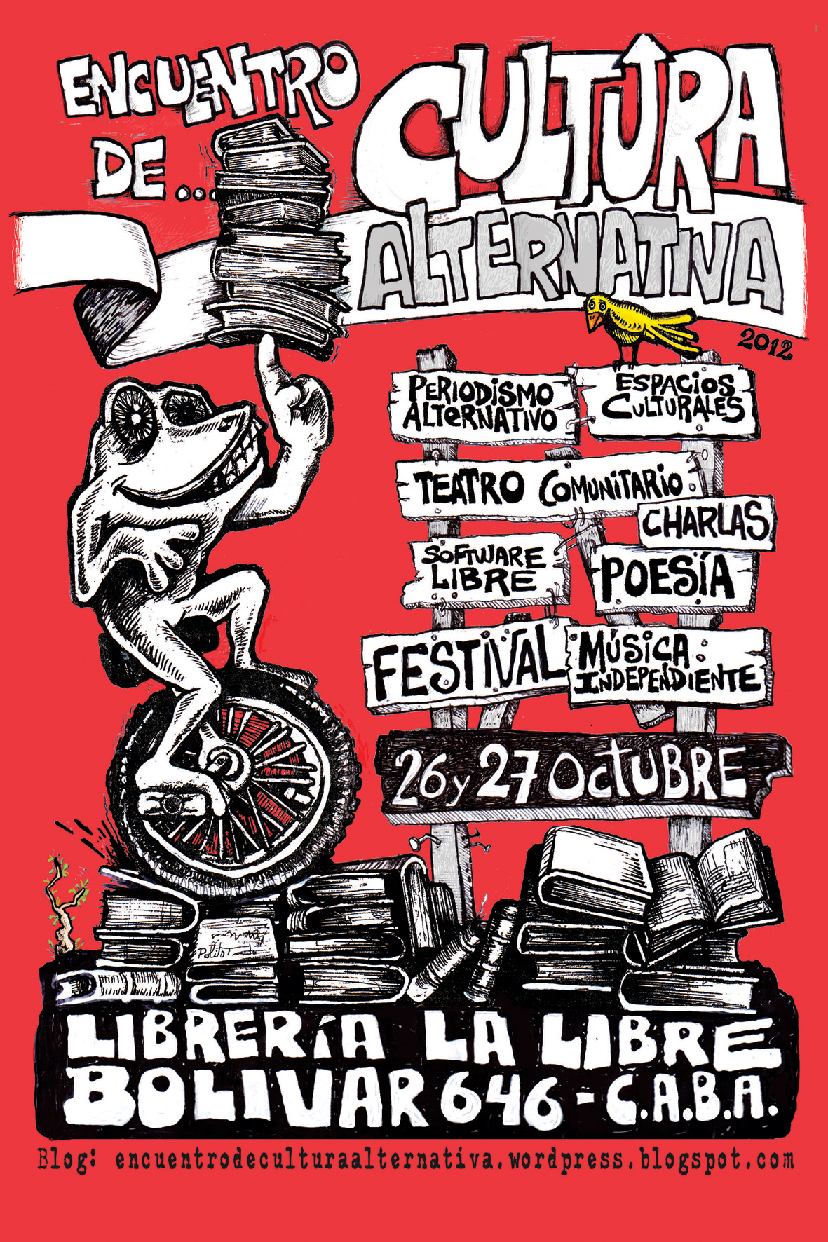 Arriba afiche del primer Encuentro de Cultura Alternativa, abajo charla con el colectivo Juguetes Perdidos y Agustín Valle en Bolívar 646. De rojo Moni Torres.El barrio también aportó lo suyo. Si bien aquél primer local estaba ubicado estrictamente en Monserrat, en el sentido espiritual, La Libre siempre fue santelmitana. Y de hecho el local actual está a cien metros del mercado de San Telmo. Pero más allá de precisiones geográficas, el barrio, que a la vez es turístico, lumpen y bohemio, formó siempre parte de la identidad del proyecto y contribuyó a que sus redes se fortalecieran. Menciono algunos ejemplos: Gito Minore, poeta, activista cultural y estudioso del heavy metal, vivía enfrente de La Libre, y se convirtió en un colaborador inmediato durante toda la primera época. En la cuadra de al lado vivía Ezequiel Alemián, poeta y comprador de libros raros, que siempre se paseaba con alguien por la librería. A la vuelta vivía Edgardo Ruso, que nos tocó el timbre para ofrecernos los libros de su editorial El Cuenco de Plata, cuando todavía no teníamos cuenta con casi ninguna editorial. A la otra vuelta vivía, y todavía vive, Francisco Nemiña, físico y bailarín de blues (sí, el blues se baila), quien junto con Brenda Berstein y la editora transisionada a bailarina de swing Celeste Plaza, se encargaron durante un buen tiempo de convertir el primer piso en una sala de baile. A tan solo dos cuadras vivía Carlos Muller, alma mater de Cineclub Dynamo, con quien organizamos más de cien funciones de películas en 16 mm, con mucho Fassbinder y Herzog, Murnau con música en vivo, Marguerite Duras, Fellini, Einsestein, Bergman y demás. Natalia Menstrual, primera escritora trans del país y autóctona de San Telmo, fue colaboradora inestimable tanto de aquella como de todas las épocas de la Libre. Raúl Lemesoff y su Arma de Instrucción Masiva residían por esa época en el Padelai, a metros del corazón de San Telmo, y La Libre se convirtió en una parte de su rutina. El poeta cocinero Roberto Poroto Riera, no hay bar santelmitano que no lo conozca, hasta llegó a residir en Libre. Y así podría seguir indefinidamente.